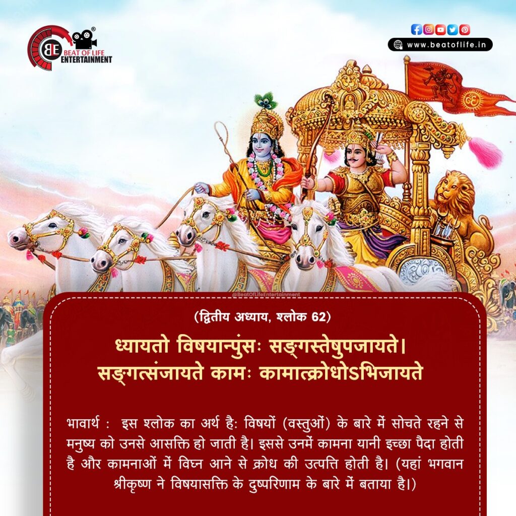 भावार्थ : इस श्लोक का अर्थ है: विषयों (वस्तुओं) के बारे में सोचते रहने से मनुष्य को उनसे आसक्ति हो जाती है। इससे उनमें कामना यानी इच्छा पैदा होती है और कामनाओं में विघ्न आने से क्रोध की उत्पत्ति होती है। (यहां भगवान श्रीकृष्ण ने विषयासक्ति के दुष्परिणाम के बारे में बताया है।)